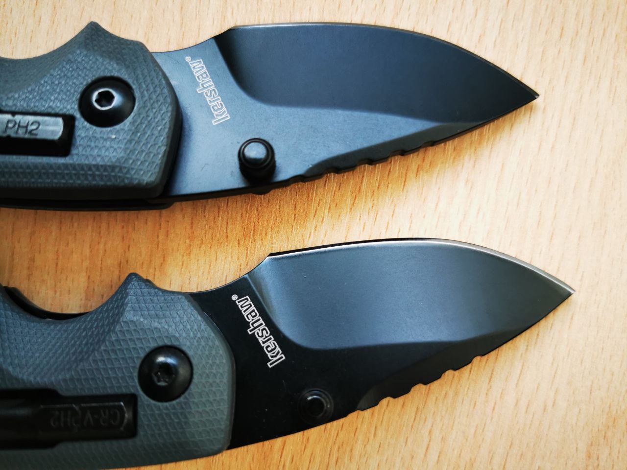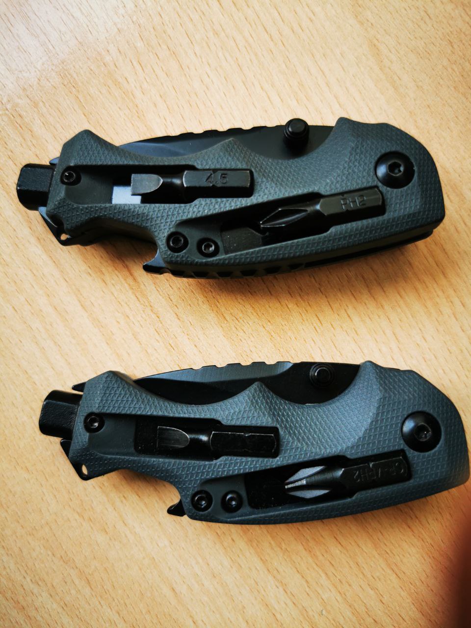 Kershaw Shuffle — настоящая рабочая лошадка! Удобный и компактный (лезвие всего 6 см), он вмещает в себя еще и открывалку с отверткой. Для тех кому часто требуется что-то подкрутить или обрезать, нож придется как никогда кстати. Помимо удобства, из преимуществ можно выделить неплохую азиатскую нержавеющую сталь 8Cr13MoV, крепкую клипсу и саму рукоять, материал которой противодействует выскальзыванию. У данной модификации в рукояти есть специальные держатели, где находятся биты.